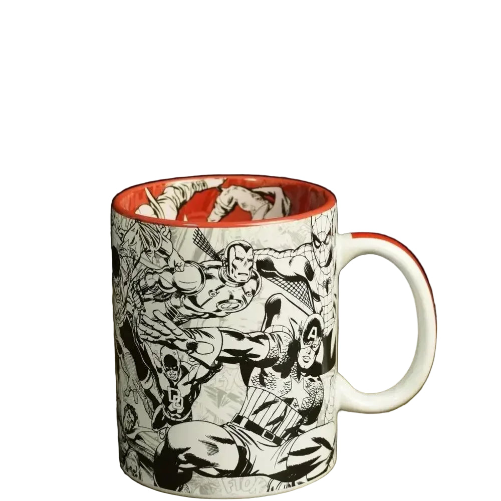 Featuring epic black-and-white comic art of iconic Marvel heroes — including your favorite armored genius, super-soldier, and friendly web-slinger — this mug captures the bold energy of classic comics. The fiery red interior adds that heroic flair worthy of a true Marvel fan.