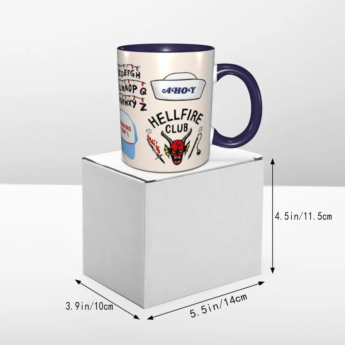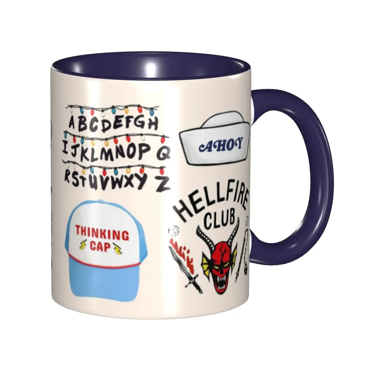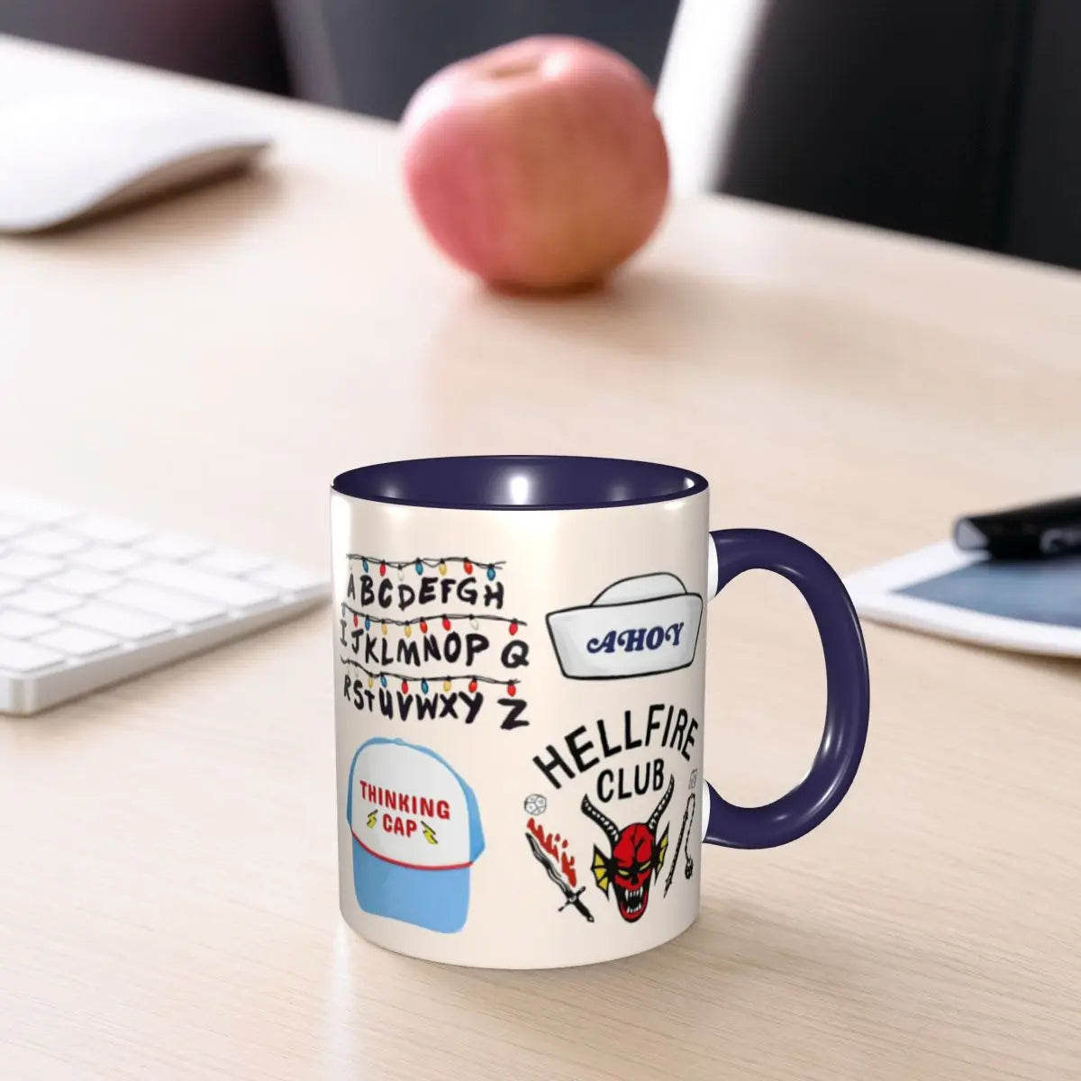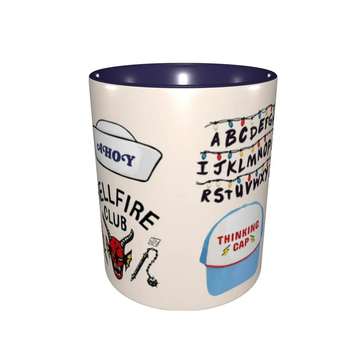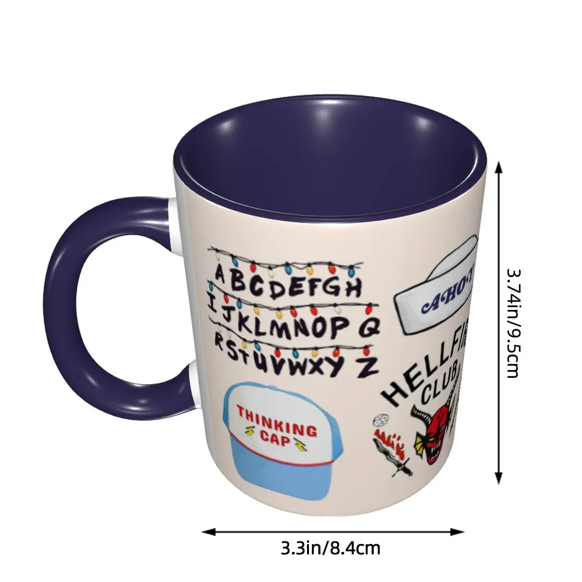 Enter the Upside Down every morning with this Stranger Things-themed mug — a must-have for Hawkins fans! Featuring iconic elements from the series like the Alphabet Wall, Ahoy hat, Thinking Cap, and Hellfire Club emblem, this mug captures all the nostalgia and mystery of your favorite show.