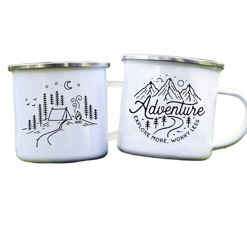 Sip your coffee by the campfire with these Adventure Enamel Camping Mugs, designed for nature lovers and explorers alike! Featuring minimalist outdoor illustrations — one with a tent under the stars and another with the phrase “Adventure – Explore More, Worry Less” — these mugs are perfect for your next hiking, camping, or road trip adventure.
