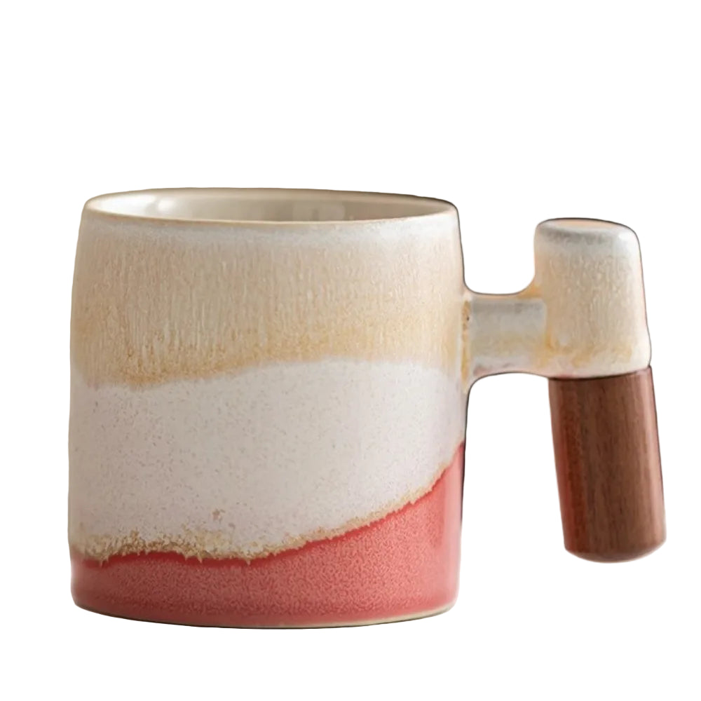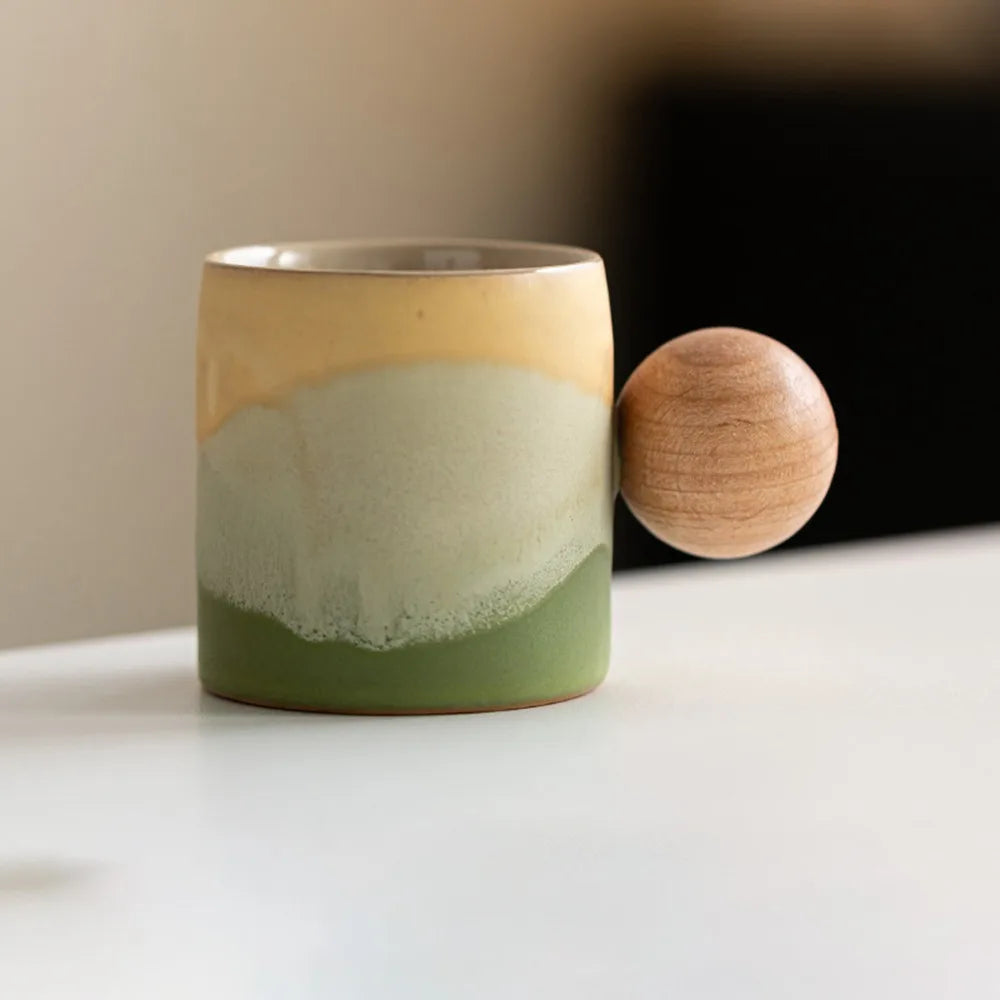 Bring a touch of artistic elegance to your morning routine with these beautifully designed ceramic mugs. Each mug features a stunning two-tone landscape glaze and a unique wooden handle, blending natural warmth with contemporary style.